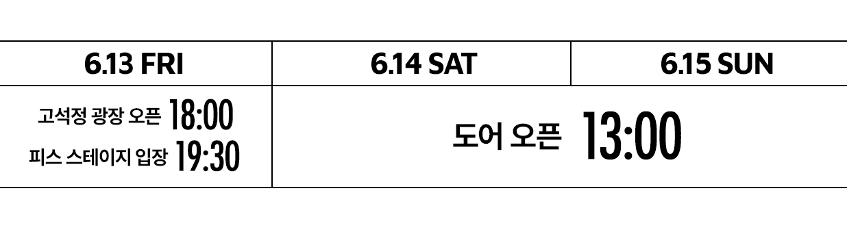 전야제에 참여하는 전일권 관객 편의를 고려하여 6월 13일(금)에 티켓 부스를 오픈합니다.